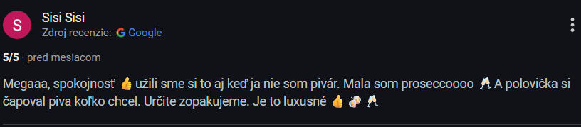 "Ste až moc drahí...rozmýšľam, či sa mi to oplatí..."- Ceny nášho pivného kúpeľu sú rovnaké ako ceny ostatných pivných kúpeľov na SK. Za takú istú cenu Vám vieme dopriať viac súkromia, kvalitnejšie pivo a viac koncetrovaný kúpeľ ako hocikde inde. Do vytvorenia nášho konceptu išlo mnoho času, úsilia, robenia neustálych zmien a hlavne veľa peňazí. Podarilo sa nám vytvoriť miesto, ktoré prináša ľuďom možnosť vypnúť a zrelaxovať spojenú s našou vášňou - pivom. Kto to nevie oceniť a hľadá iba otrepanú turistickú atrakciu, nech ku nám radšej ani nejde.