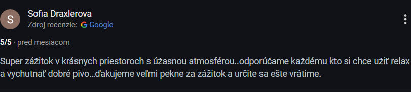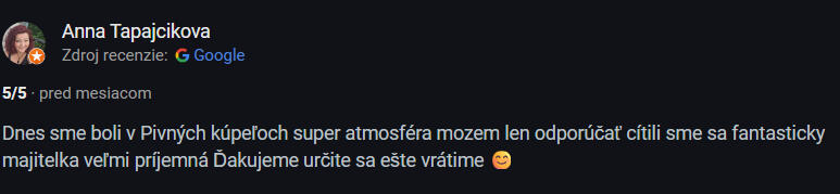 "Ste až moc drahí...rozmýšľam, či sa mi to oplatí..."- Ceny nášho pivného kúpeľu sú rovnaké ako ceny ostatných pivných kúpeľov na SK. Za takú istú cenu Vám vieme dopriať viac súkromia, kvalitnejšie pivo a viac koncetrovaný kúpeľ ako hocikde inde. Do vytvorenia nášho konceptu išlo mnoho času, úsilia, robenia neustálych zmien a hlavne veľa peňazí. Podarilo sa nám vytvoriť miesto, ktoré prináša ľuďom možnosť vypnúť a zrelaxovať spojenú s našou vášňou - pivom. Kto to nevie oceniť a hľadá iba otrepanú turistickú atrakciu, nech ku nám radšej ani nejde.